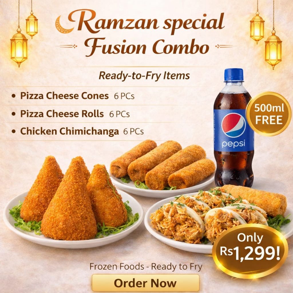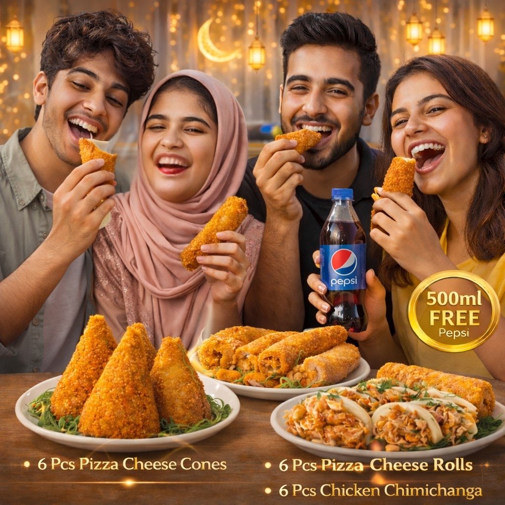 Ajwa Foods Ramzan Special Fusion Combo – Pizza Cheese Cones, Cheese Rolls & Chicken Chimichanga + FREE 500ml Pepsi